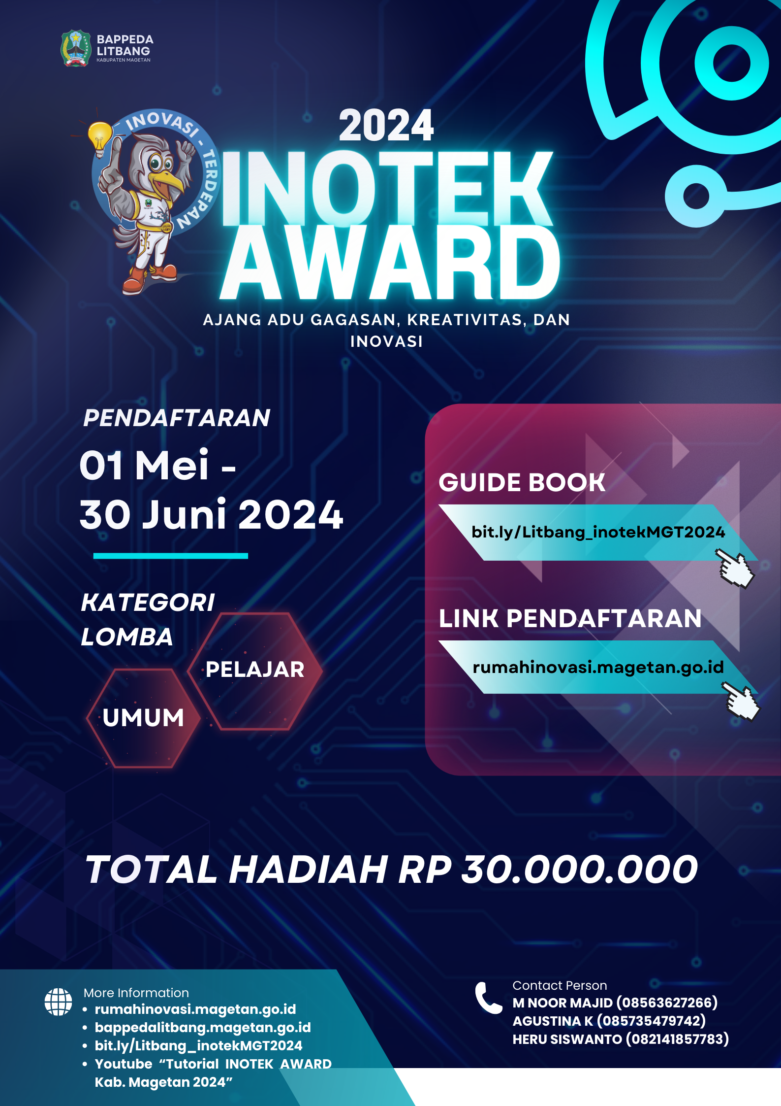 Informati detil mengenai Ajang Inotek 2024 bisa melalui rumahinovasi.magetan.go.id, bappedalitbang.magetan.go.id, https://bit.ly/Litbang_inotekMGT2024, serta video youtube “Tutorial INOTEK AWARD Kab. Magetan 2024”.